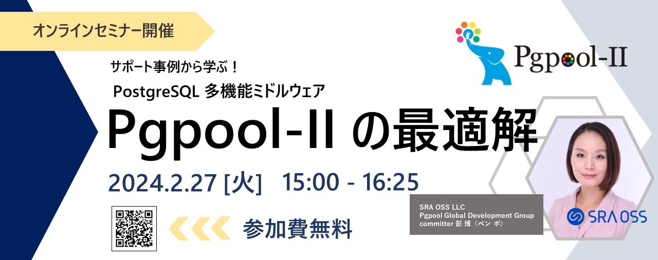 本セミナーでは、 Pgpool-II の概要や最新機能はもちろん、SRA OSS の数多くの導入実績やサポート経験を踏まえて、Pgpool-II の導入や運用のノウハウをご紹介します。また、海外で活躍する開発者より、現在開発中の「global connection pool」紹介セッションもご用意しています。