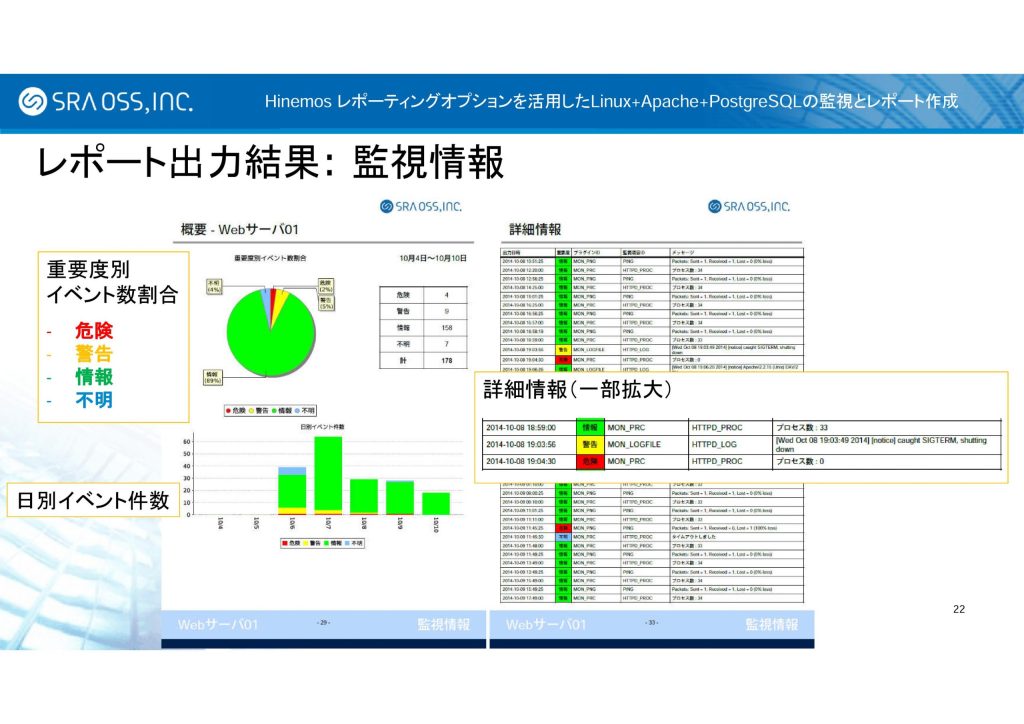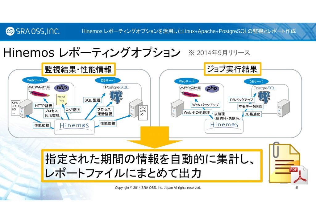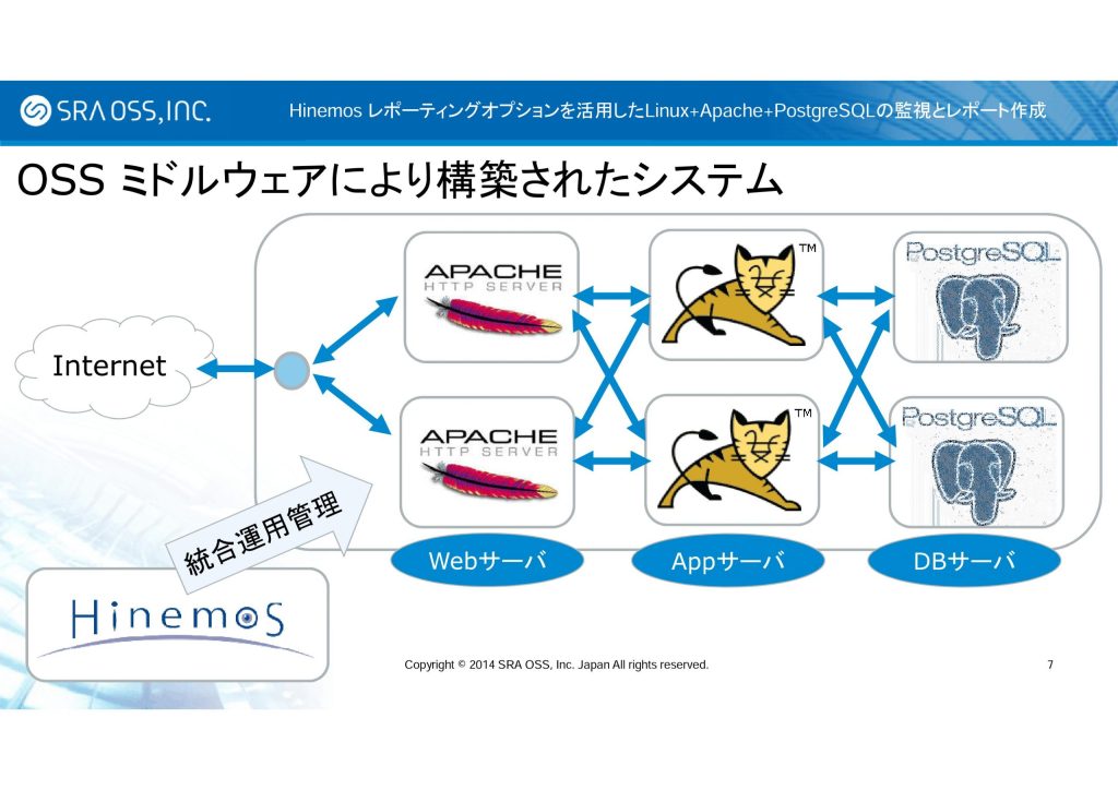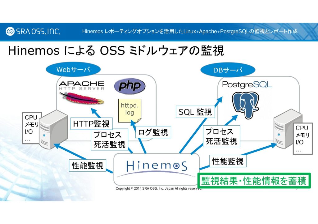 2014 年 12 月 4 日、5 日に東京ミッドタウン カンファレンスで開催された NTTデータ主催のイベント「Hinemos World 2014」において、 SRA OSS, Inc. 日本支社では「Hinemos レポーティングオプションを活用した、Linux + Apache + PostgreSQL の監視とレポート作成」と題したプレゼンテーションを行いました。