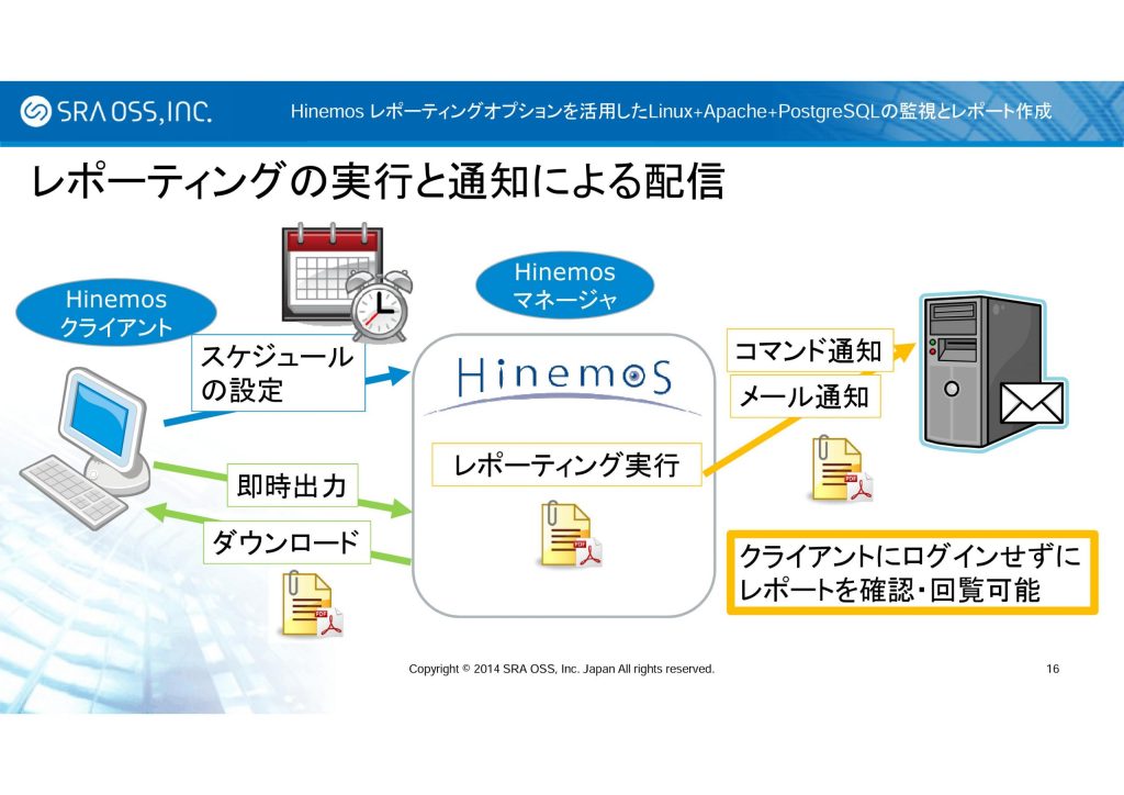 基本的に、Hinemos レポーティングオプションは Hinemos マネージャ上で動作します。マネージャ上でレポート生成して、ユーザに通知します。