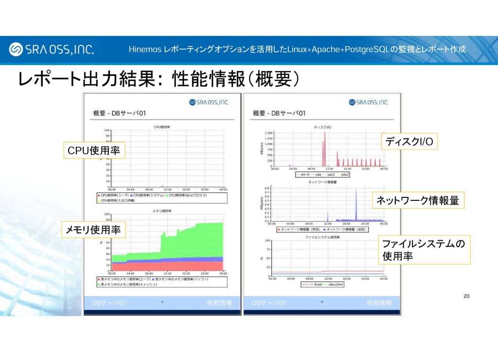 これは性能情報の概要で、CPU 使用率、メモリ使用率、ディスク I/O、ネットワーク情報量、ファイルシステムの使用率について、グラフで出力させています。より詳細なデータを出力することも可能です。