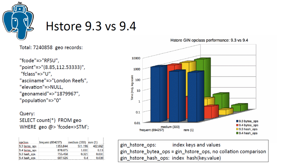 また、検索性能も改善されました。たとえば、PostgreSQL のなかで「ブラウン」と「PostgreSQL」、この二つの言葉をサーチしてみましょう。PostgreSQL 9.3 ではあくまでも「PostgreSQL」という言葉を先に検索します。よく出てくる言語の方に時間が比例する仕組みで、結果が表示されるまでに非常に時間がかかりました。対して 9.4 では、「ブラウン」というめったに出てこない言語を先にサーチしていきますので、非常に時間を短縮できるようになったのです。