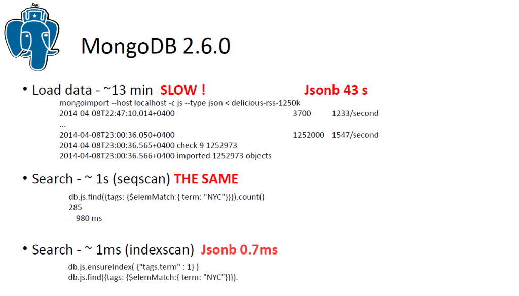 MongoDB と比較をしてみました。データのローディングでは、MongoDB の方が非常に遅いという結果です。JSONB 43 秒、そして MongoDB 13 分という結果になります。