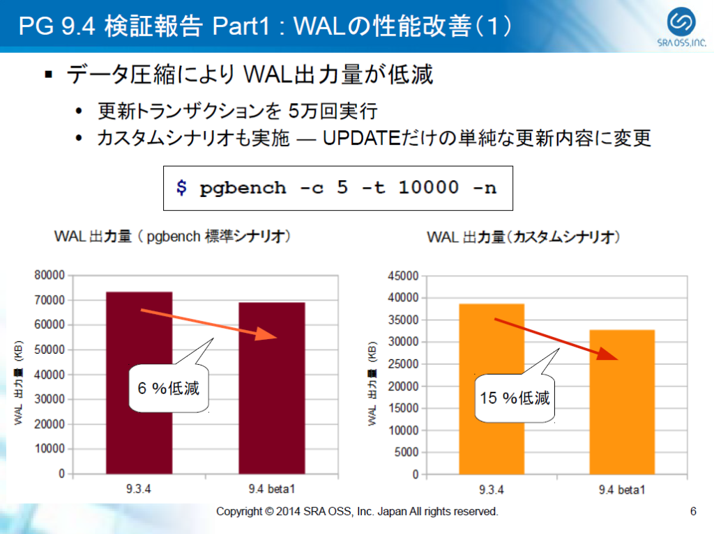 pgbench という負荷ツールで、更新トランザクションを 5 万回実行したところ、pgbench 標準シナリオで流すと WAL サイズが 6% 少なくなっています。さらにカスタムシナリオも実行し、アップデートだけのより単純な更新内容にしたところ、15% 低減しました。