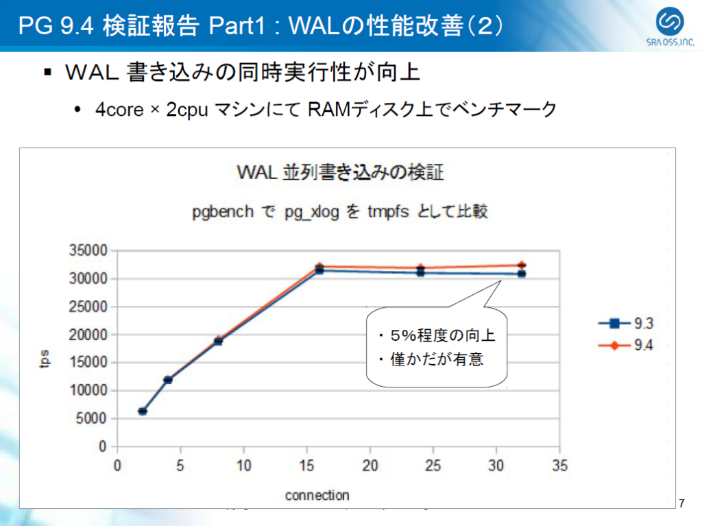 もうひとつ WAL の性能改善としまして、同時実行性が向上したと言われています。2012 年に PostgreSQL が 9.1 から 9.2 にバージョンアップした時も、同時実効性の改善があり、効率が上がったという話がありました。今回もその時と同じように、同時実行の競合を減らすような修正が入っております。その結果はどうかというと、5% 程度の向上がありました。とくに同時実行を増やしていくと性能が上がっていく、ことがわかりました。