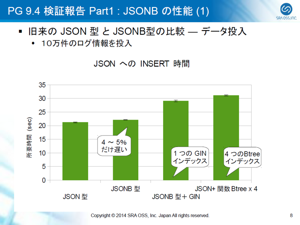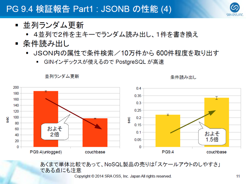 またセミナー後半では、SRA OSS が実際に NoSQL との性能比較を交えて行った PostgreSQL 9.4 の JSON 型について検証結果をご紹介しました。