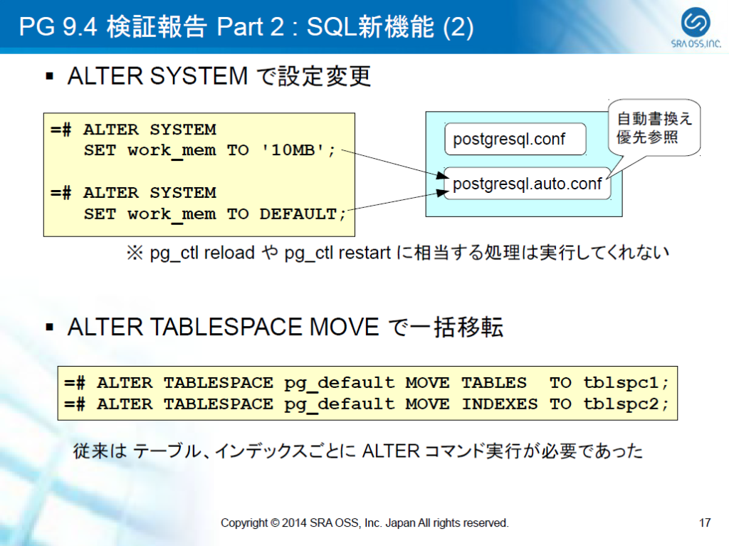 続きまして、ALTER SYSTEM という新しいコマンドが追加されました。SQL コマンドで PostgreSQL の設定を変更することができます。