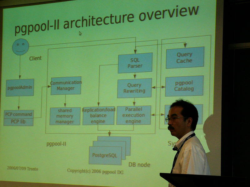 弊社も石井が開発した PostgreSQL 用コネクションプールサーバ「pgpool」と、その後継プロジェクトで、情報処理推進機構 (IPA) の支援のもとに現在弊社で開発が行われている「pgpool-II」の講演とデモを行い、コアメンバも含め多くの方が参加してくださいました。
