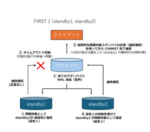 FIRST 1 の場合は、優先スタンバイが応答しない場合でも、wal_sender_timeout により接続は切断され、次に優先度の高いスタンバイが同期対象として選択されます。