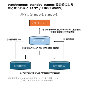 また、ANY 2 や FIRST 2 のように台数を 1 以上で指定した場合は、指定した台数のスタンバイに対して、synchronous_commit で指定された段階まで WAL の処理が完了するのを待ってから、クライアントにコミット完了が通知されます。