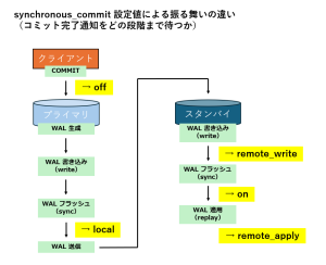 | 通知タイミング | スタンバイで行われる WAL の処理を待たずに、クライアントにコミット完了を通知する |