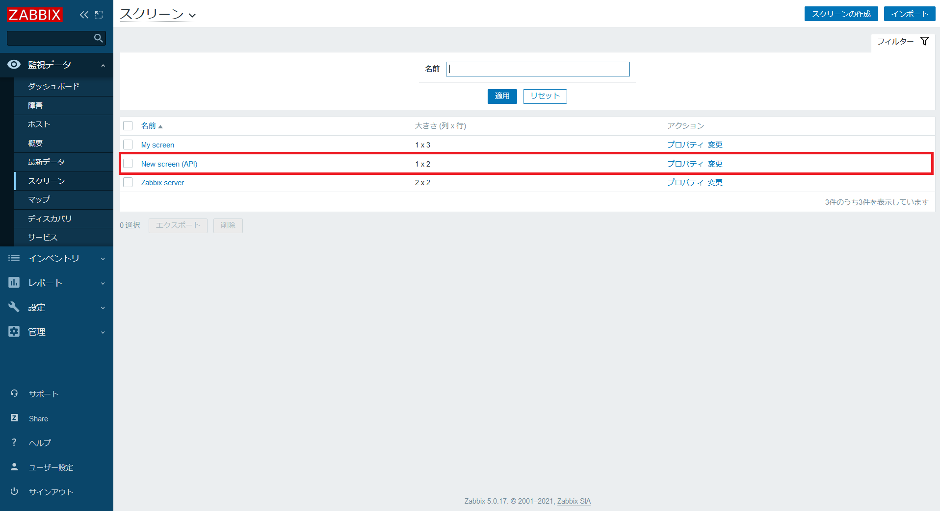 Zabbix の管理画面で、[監視データ] → [スクリーン] を開き、「スクリーン」で「New screen (API)」を選択して、スクリーンが作成されていることを確認します。