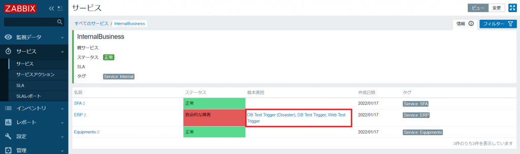Zabbix 6.0 では障害タグを指定するため 1 つのサービスに対し、複数のトリガーが影響するようになります。新しく追加された「根本原因」列には、そのサービスの状態に影響を及ぼしているトリガーの一覧が表示されるようになります。